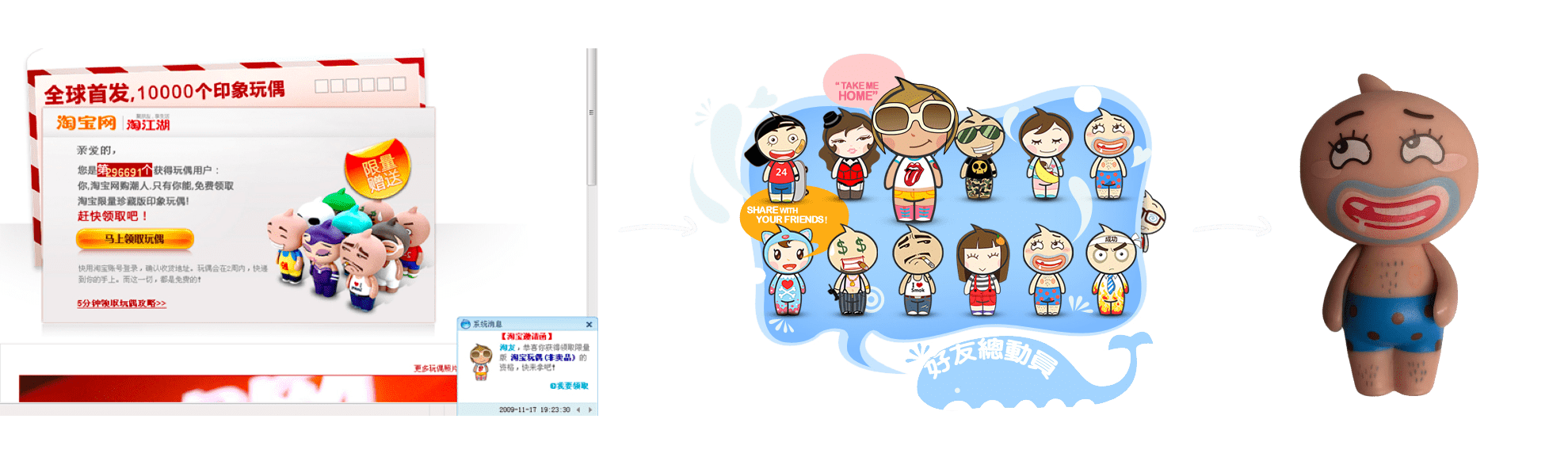 2009年,我实习的第一个任务是做淘宝社交社区(当时叫淘江湖)的一个运营活动,活动本身并不复杂,需要我做一个拼图游戏,用户邀请好友加入社区,获得拼图的碎片,挤满碎片拼出公仔的图案后,就能获得公仔。